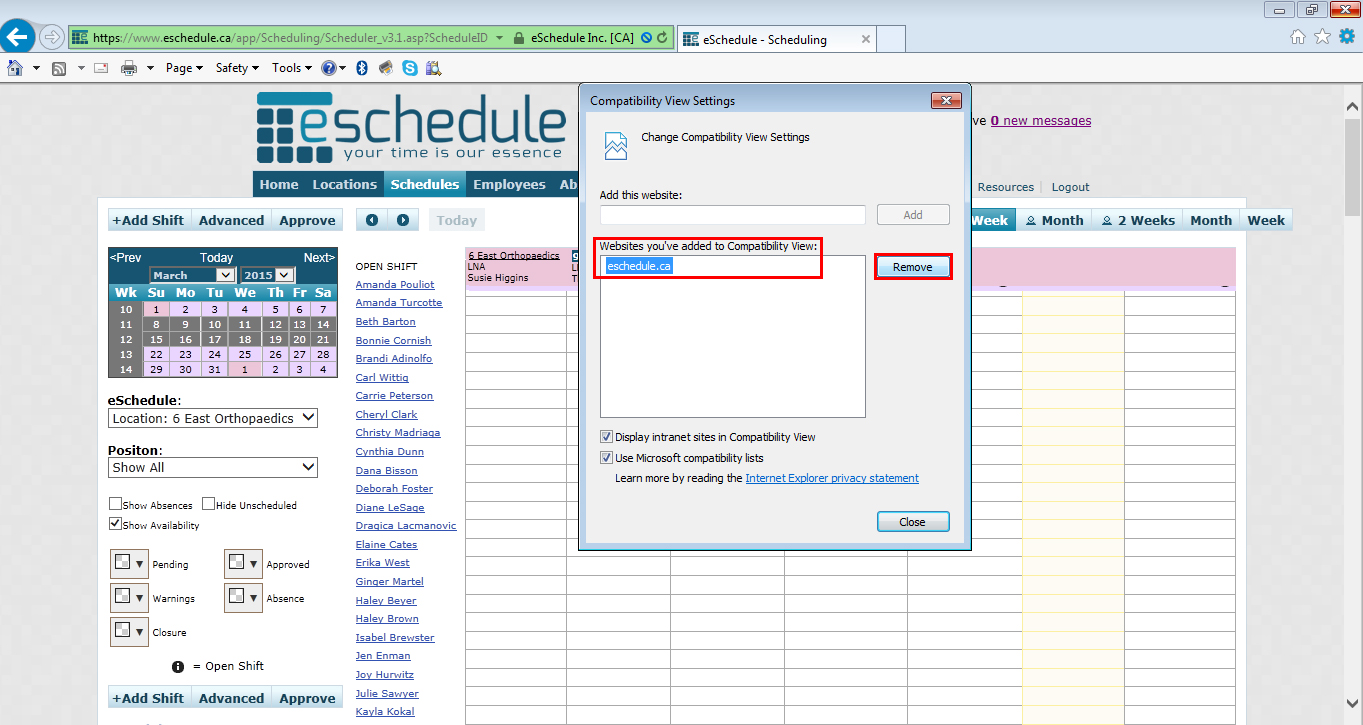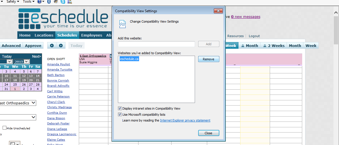 - You should see “eschedule.ca” listed under “Websites you’ve added to Compatibility View:”. Click on this URL to highlight it, then click the “Remove” button. Once it’s been removed, you can click “Close”.